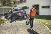 Ergonomisk transport av sykkelstativet takket være integrerte transporthjul og bærehåndtak