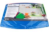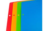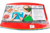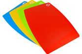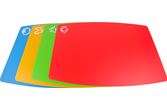 Farger og symboler for å indikere hvilken mattype de skal brukes til; rått kjøtt, grønnsaker, fisk og kylling. Plassbesparende.
