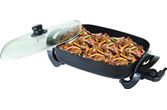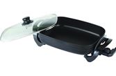Rommer 8 liter veske. Aluminiums materiale i god kvalitet. Meget kraftig og solid non-stick belegg i panna. Kan benyttes som buffétpanne på lav temp. Skjult varmeelement for optimal spredning av varmen i pannen. Helt klart glasslokk med håndtak som ikke blir varmt. Justerbar temperatur opp til 250 grader. Kontroll lampe. 4 ripefrie føtter. Damp hull og støtsikkert lokk.