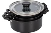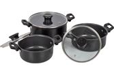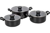 Luksuriøst og stilig sett med 3 kasseroller. Laget av sterk karbonstål, non-stick belegg, varmebestandige håndtak og glasslokk. Egnet bra for varmekildene gass, keramikk og elektrisk.