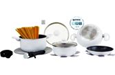 - 2x kaseroller, 2x lokk, 2x stekepanner og løst håndtak
