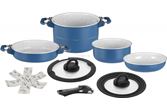 Dette kokekarsettet for fritidskjøretøy og båter er perfekt for alle som ønsker å lage mat i bobilen, campingvognen eller båten. Settet består av gryter og panner av høy kvalitet med en induksjonskompatibel bunn og ripebestandig keramisk non-stick-belegg. Grytene og pannene kan stables inni hverandre for å spare plass og har et nyutviklet håndtak og koblingssystem (Magnetogrip), som muliggjør en betydelig reduksjon i pakkestørrelsen på grytesettene ved å bruke nedfellbare håndtak med integrerte magnetiske elementer og gjør også bruk av en surringsstropp for å stabilisere kjelen og pannen under transport unødvendig.
