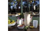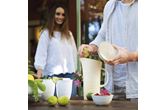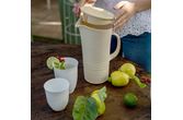 En mugge med en slank, strømlinjeformet form og et praktisk lokk for å beskytte innholdet, spesielt når du er utendørs. Det integrerte gitteret holder isbiter eller fruktbiter i kannen når du heller. Laget ved å resirkulere engangs flasker.