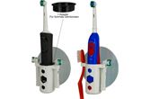 Dette settet består av en tannbørsteholder i elastisk gummi og en EXE Hook selvklebende festeplate på 10 x 10 cm. I tillegg følger det med en adapterring som gjør at holderen passer både tynne og tykke tannbørstehåndtak. Holderen passer alle elektriske tannbørster. Oppladbare modeller er ofte litt smalere og brukes sammen med adapteren, mens batteridrevne tannbørster har tykkere håndtak og brukes uten adapter.