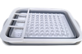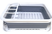 Praktisk og plassbesparende oppvaskstativ med eget dryppbrett, ideelt for camping, bobil og små kjøkken. Stativet har romslig plass til tallerkener, glass og bestikk, og lar vannet renne rett ned i brettet under.