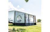 Travellife Scala frontpanel med dør, bredde 1,10–1,44 m, passer blant annet til markiser fra Thule, Fiamma og Dometic. Kombiner døren med front- og sidepanelene for å lage en skjermet løsning rundt markisen på kort tid. Duken er laget av dobbeltbelagt polyester og er dermed både vann- og UV-bestandig. Døren er utstyrt med en rund åpning med glidelås. Du kan rulle døren til siden og bruke åpningen som inngang og utgang.