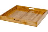 Bordplaten er sært solid og har samtidig et stilig utseende. Den er laget av bambus og kan vendes og brukes, delvis på grunn av håndtakene, som serveringsbrett. Ved å plassere dette brettet på en krakk kan den brukes som et praktisk sidebord.